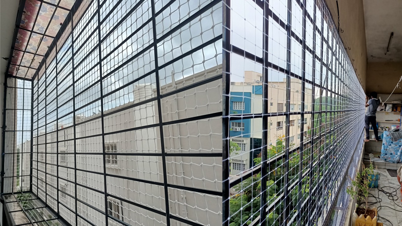 We are the skilled experts in fixing Safety nets for Balcony Safety Nets, Pigeon Safety Nets, Anti Bird Nets, Pigeon Nets for Balconies, Cricket Net Practice, Kids Net for Balcony, Construction Safety Nets, Duct Area Safety Nets, Building Safety Nets, Industrial Safety Nets, Swimming Pool Safety Nets Stairway Safety nets, Monkey Safety Nets, Terrace Top Nets, Glass Safety Nets, Car Parking Safety Nets, Coconut Tree Nets, All types of Safety Nets, HDPE Nets - Nylon Nets.